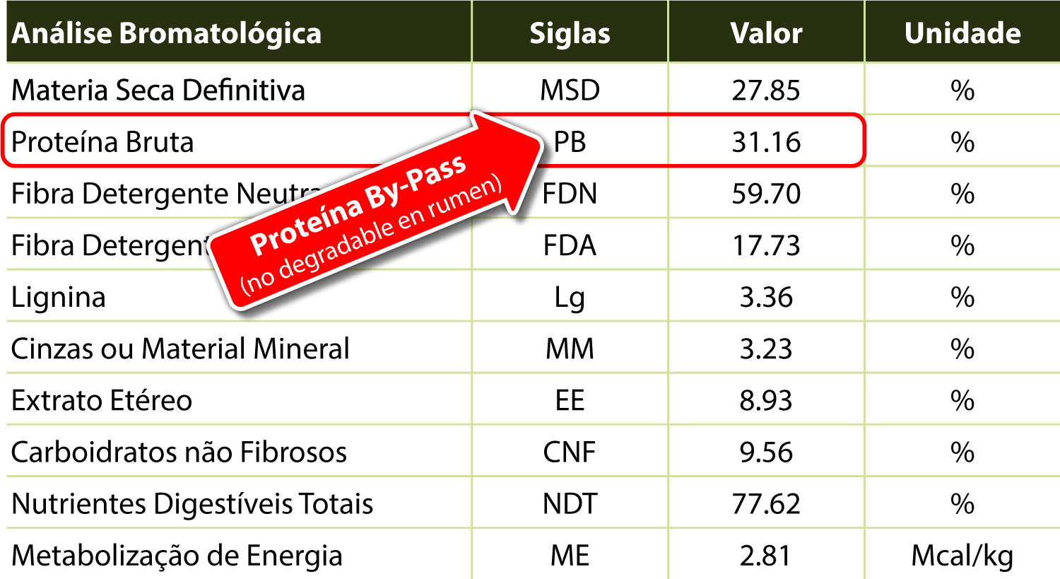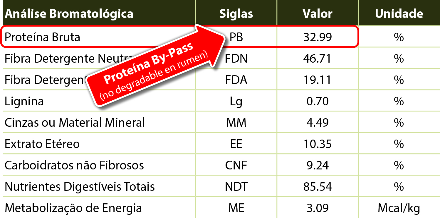Um produto com características proteicas (31 a 33% em base seca), tem sua importância na nutrição dos animais por ter grande porção das proteínas “By Pass”, uma boa quantidade de fibras e ótima palatabilidade.
