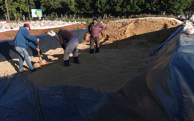 • Conservação: Depois de tapar a silagem com a lona plástica é necessário cobrir o silo com terra ou areia, que pode ou não estar ensacada. Isto garante uma boa proteção da silagem, evitando qualquer incidente. O monitoramento estacional é necessário para determinar sua condição geral, uma vez que qualquer dano na superfície da lona pode comprometer a qualidade do produto armazenado. É preciso garantir que não há nenhuma entrada de ar, água ou luz solar no silo.